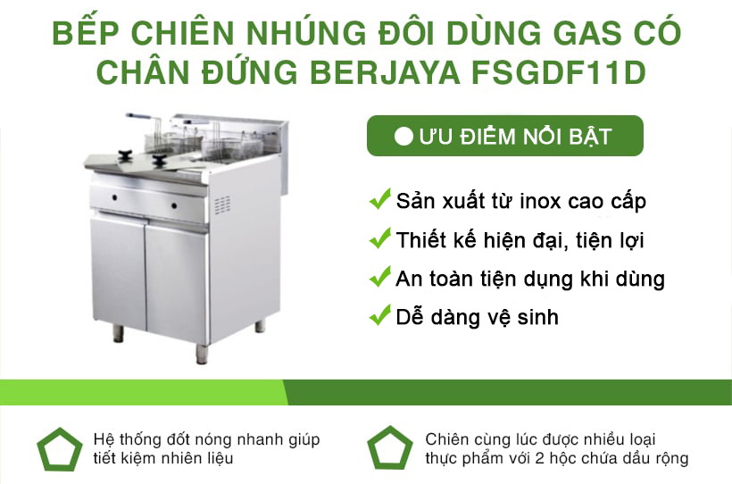 Bếp chiên nhúng đôi gas Berjaya thiết kế với nhiều tính năng nổi bật, bao gồm: