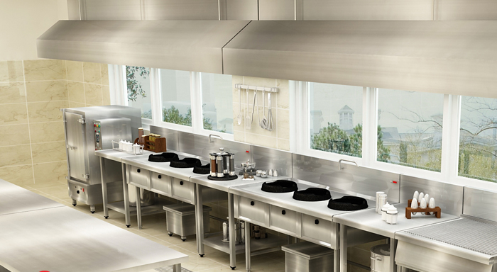 - Chụp hút khói công nghiệp: Đặt trên khu nấu để hút mùi, đảm bảo không gian thoáng.