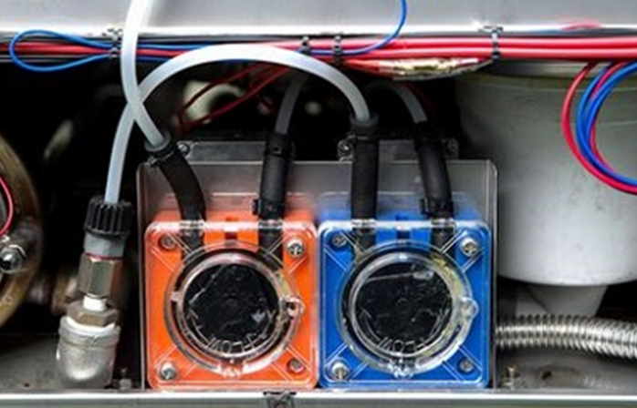 Bơm hóa chất được tích hợp sẵn trong máy sẽ bơm lượng hóa chất tẩy rửa, khoảng 18 – 20ml/ mẻ.