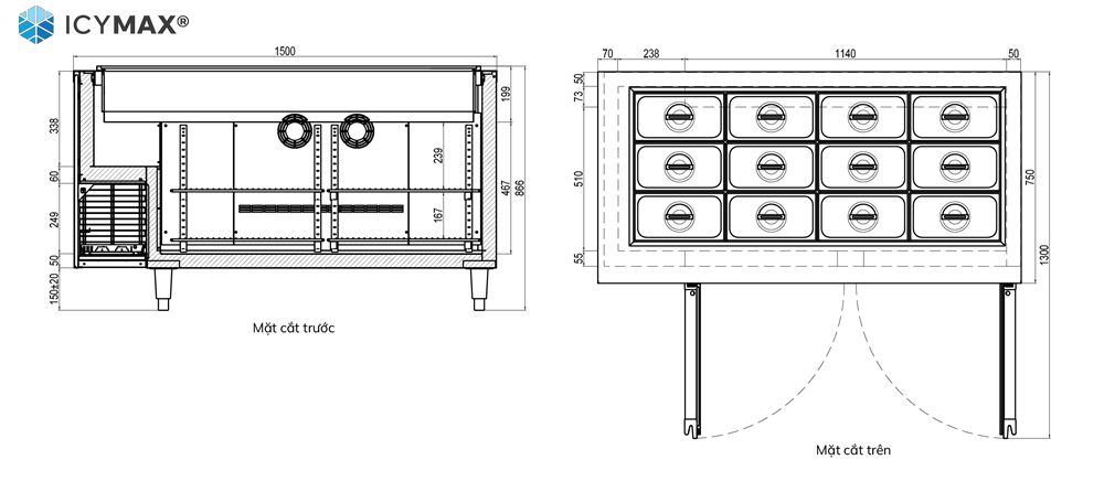 Đặc điểm sản phẩm Tủ bàn salad Icymax 2 cánh inox 1500×750